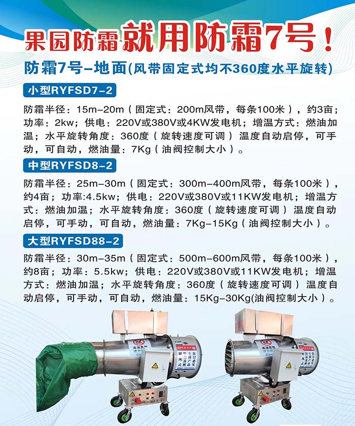 1.燃油高空款:防霜半徑≥50m;功率:10.5kw;安裝高度7米。☆增溫方式:逆溫層+燃油;水平旋轉(zhuǎn)角度:360度(旋轉(zhuǎn)速度可調(diào)節(jié));防霜機(jī)自動(dòng)上下擺動(dòng),擺動(dòng)角度和幅度均可自由調(diào)節(jié);不可有明火噴出防霜機(jī)出口;配有安全檢測裝置,當(dāng)火熄滅后供油系統(tǒng)自動(dòng)斷油;配有高空逆溫層測溫裝置和測地表溫度裝置;再有逆溫層時(shí)可以只開防霜機(jī),當(dāng)逆溫層消失時(shí)可開啟燃油裝置且可以調(diào)節(jié)大小火量。380V電源。